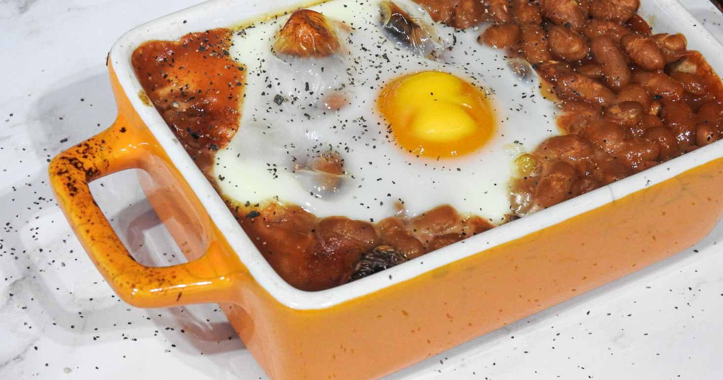 Crack an egg straight on top of the beans. Place in an oven preheated to gas mark 5/190c for 15-20 minutes, the yolk of the egg will be fairly solid if left for 20 minutes so if you prefer a runny egg bake for just 15.