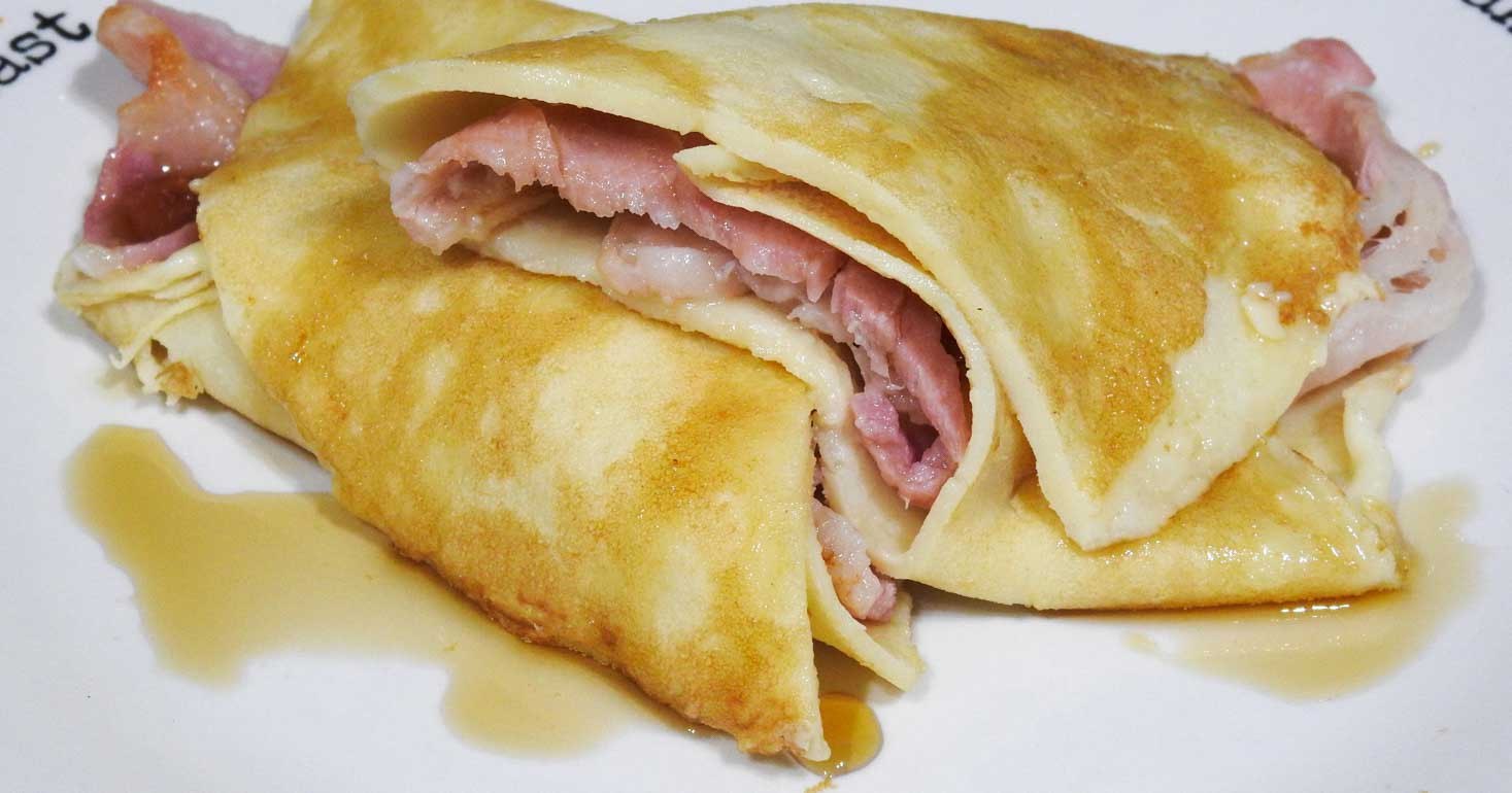 - Place bacon in a crepe, roll and drizzle over the maple syrup.