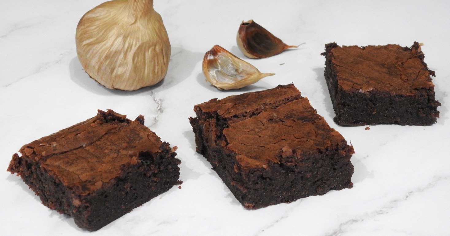 Finely chop your black garlic or use a garlic rocker (best tool ever, <a href="https://www.amazon.co.uk/s?k=garlic+rocker&i=kitchen&crid=2KT0LJUUY4FJU&sprefix=garlic+rocker%2Ckitchen%2C71&ref=nb_sb_noss_1"?check them out on amazon if you don't have one) to crush it, it is very soft and mushy so doesn't make much breaking up (you could also use black garlic paste which is available in some supermarkets if you can't get black garlic bulbs). Add the black garlic into your brownie mix and beat in well.