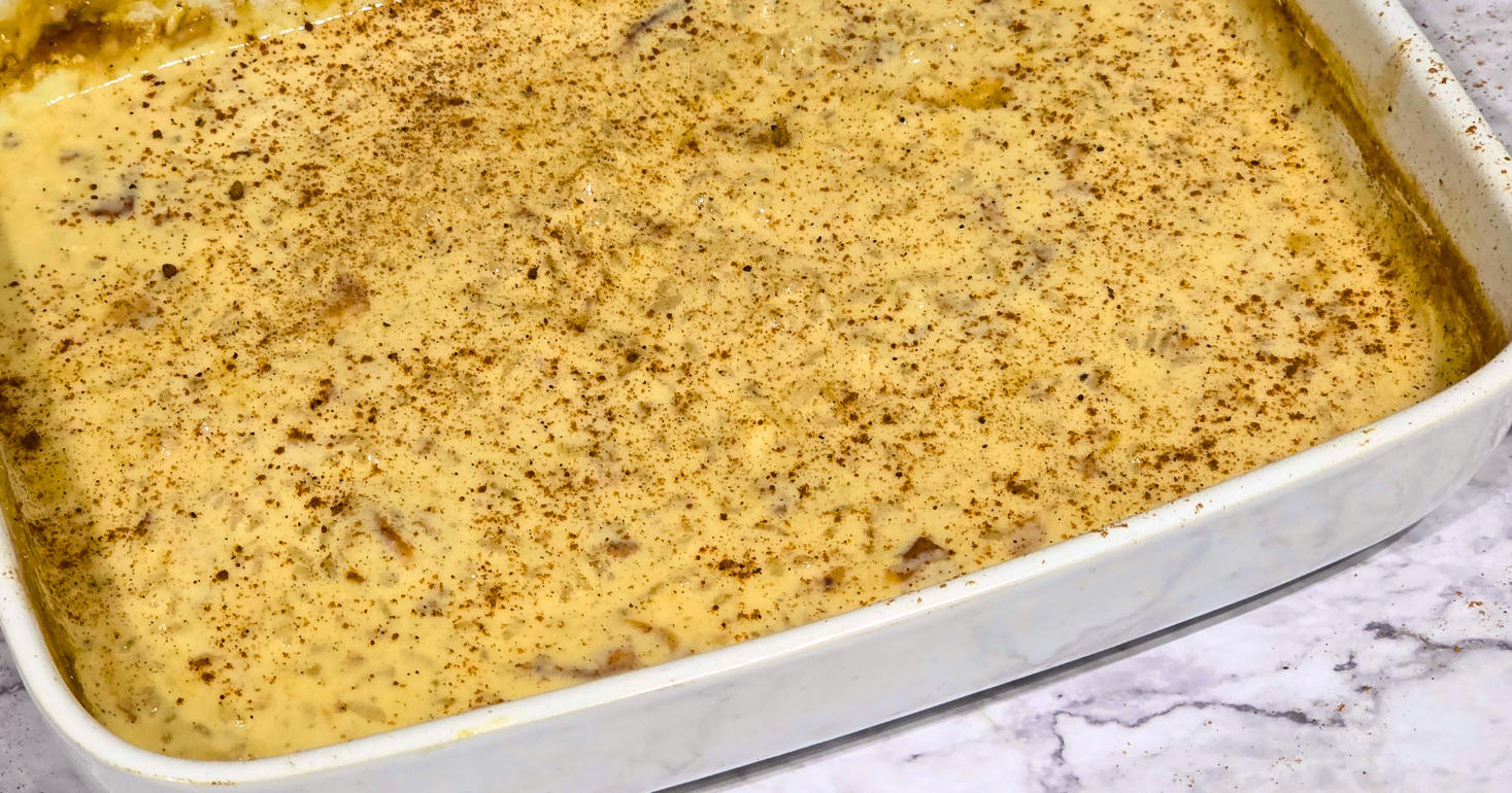 Rinse the pudding rice to wash away the starch then place in a casserole dish or similar ovenproof vessel and pour over the milk mixture.
