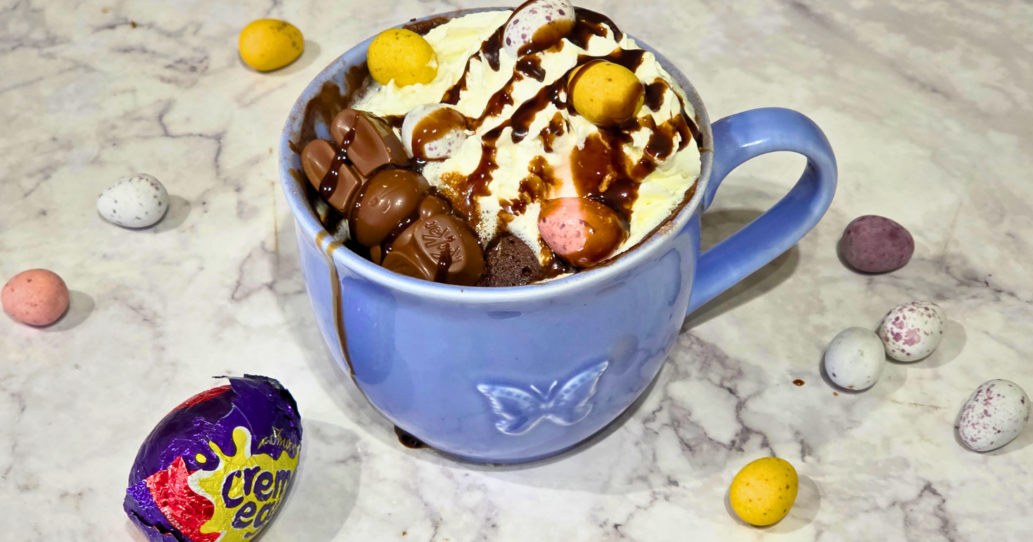 Feel free to eat straight out of the mug for a quick, warm gluten free molten cake with only one cup to wash, top however you like, I used some squirty cream, gluten free KitKat Bunny and some Mini Eggs with a drizzle of chocolate sauce. Or, if you prefer, tip the cup upside down on a plate, and do the same, when you cut into the middle the Creme egg will flood out.