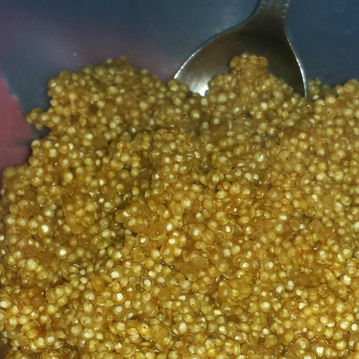 Add the quinoa to a pan and pour in the stock and add the curry and chilli powders, put on a low/simmer heat and allow the quinoa to absorb all of the stock, the quinoa is done once it has "popped" (goes from a hard ball to a ball that looks like it has split open). If all the stock absorbed before it "pops" add a little more boiling water.
