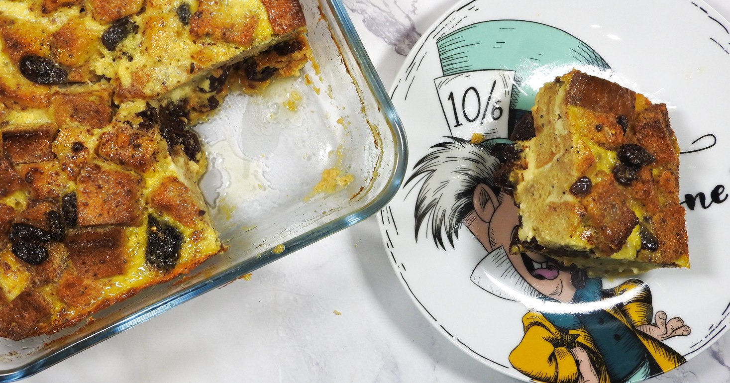 Chop your gluten free bread into chunks - a quite solid gluten free bread works best for this as the drier the bread the better pudding you get. Grease a 10inch square baking tin and chuck in the bread chunks.