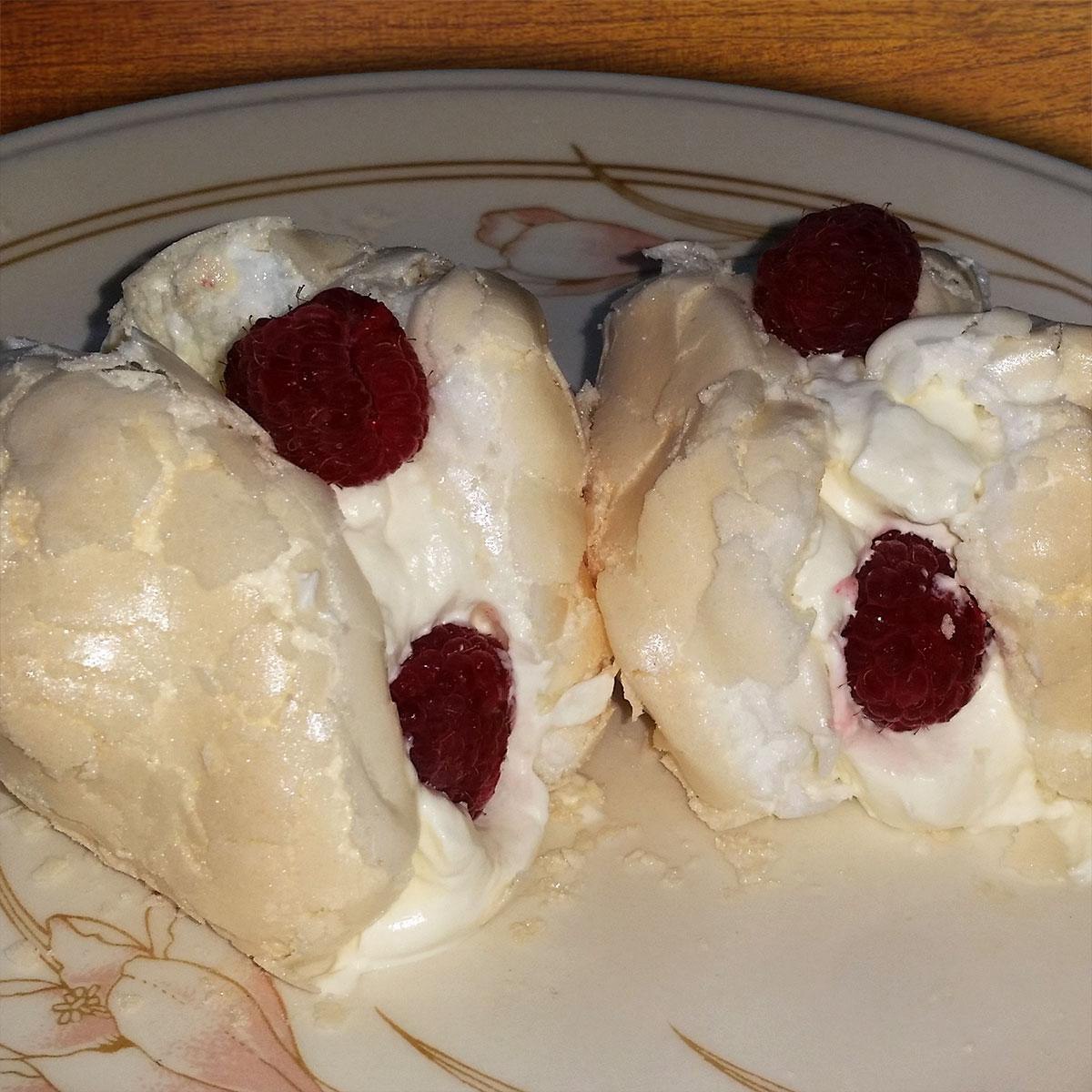 Whisk cream until thick, place a spoonful on the bottom side of one piece of meringue, add a few raspberries and then place another meringue on the other side.