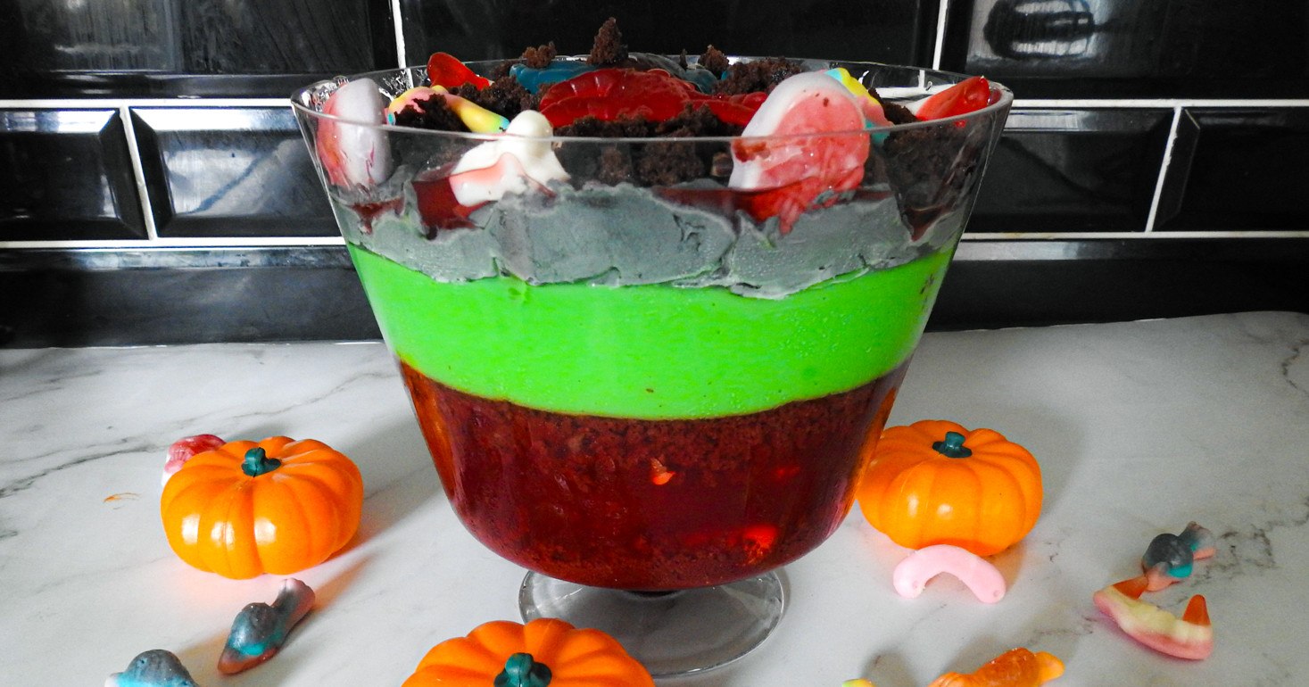 NB: This doesn't have to be just for Halloween, skip all the food colourings and sweets and change the cake and you have a regular trifle. Use a thick, hardy cake like a madeira cut into chunks in the jelly and top with whatever you like - sugar stands, broke up chocolate etc!