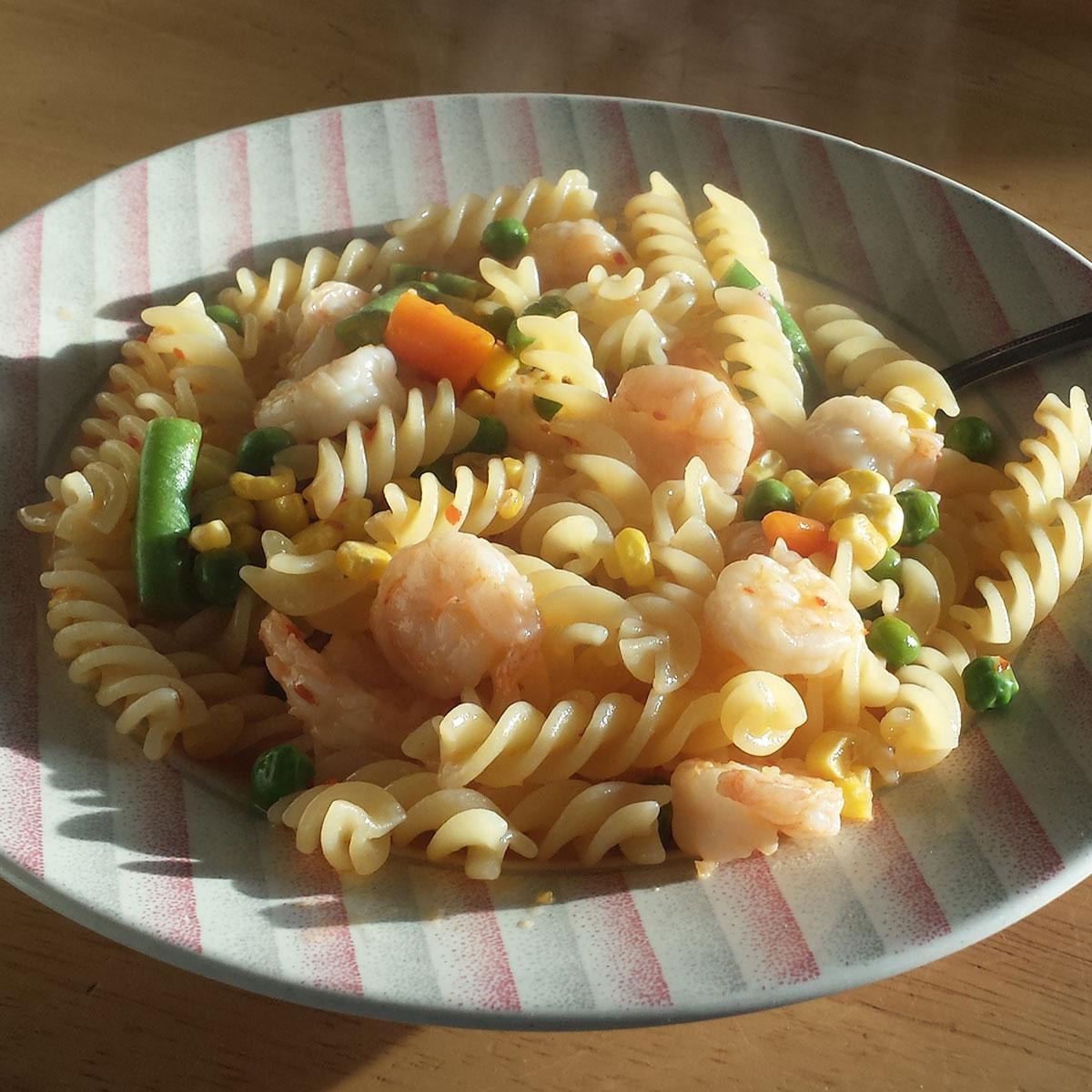 Once the pasta is cooked (soft to the touch), drain off the water and place back over a low heat, add in all the vegetables, sweet chilli sauce and prawns, stir well and let the prawns and sauce heat up, once heated the pasta is ready to be served.